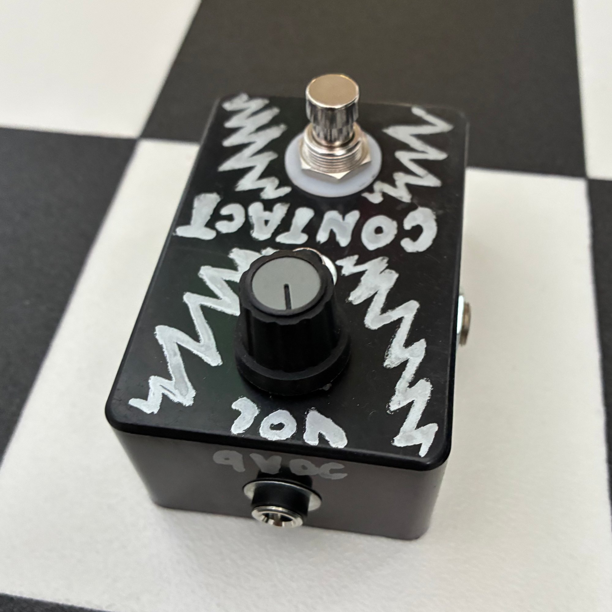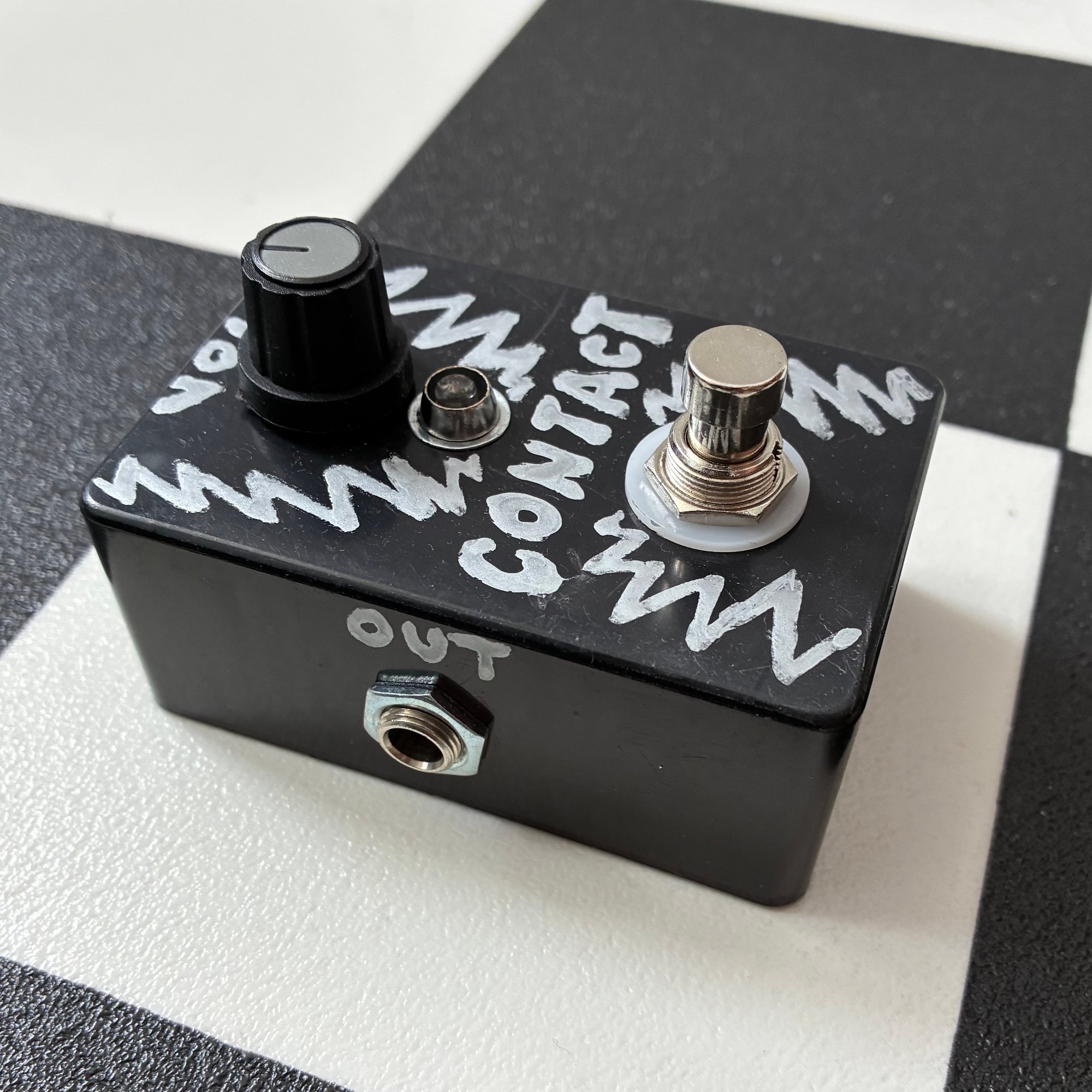 The Contact is a unique one knob fuzz face circuit that has been modded to sound like the splutter of a dying battery being used to power it. Short sustain and synthy velcro-y tones with just a volume control for a simple fat sound.